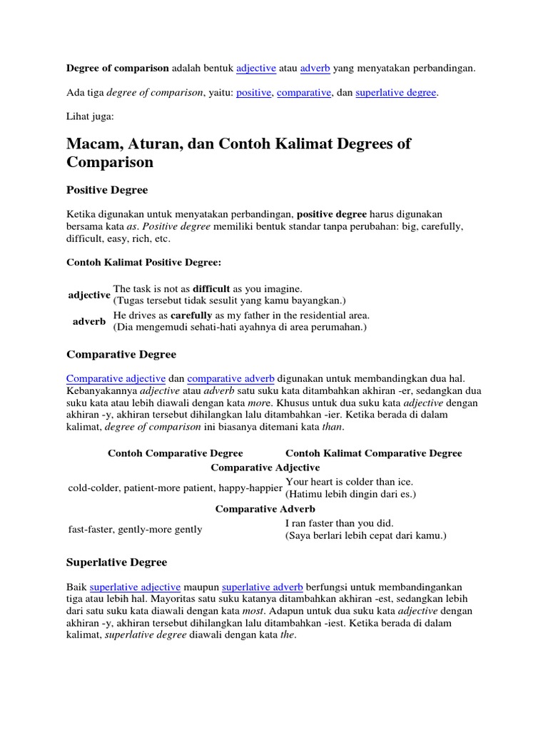 Contoh perubahan adjective dari positive, comparative dan superlative secara beraturan alias regular. Dadang and rahmat are twins. The formation of the comparative and superlative depends on the number of syllables in the adjective: If the adjective has a consonant + single vowel + consonant spelling, the final consonant. Kalo sudah, yuk coba jawab latihan soal degree of comparison di bawah ini untuk mengetahui sudah sejauh mana kita paham tentang materi ini. Yuk belajar melengkapi soal berikut menjadi kalimat degree of comparison. Kalau nama kamu belum tercantum, segera ikuti latihan soal comparative dan superlative di bawah ini. How to form comparative and superlative adjectives. • we use comparatives and superlatives to compare two or more nouns. Simak contoh di bawah ini. Are you confused about comparatives and superlatives? They look the same, but they have some differences. Mary is the most thoughtful person i've ever met.